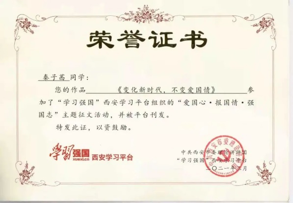 英国365集团官网秦子茜“变化新时代,不变爱国情”入选强国征文 变化新时代,不变爱国情 2020年注定是不平凡的一年,一场新冠肺炎疫情席卷了中国大地,然而中国力量却以令人振奋的速 度在发展,全中国人民凝聚了起来,...