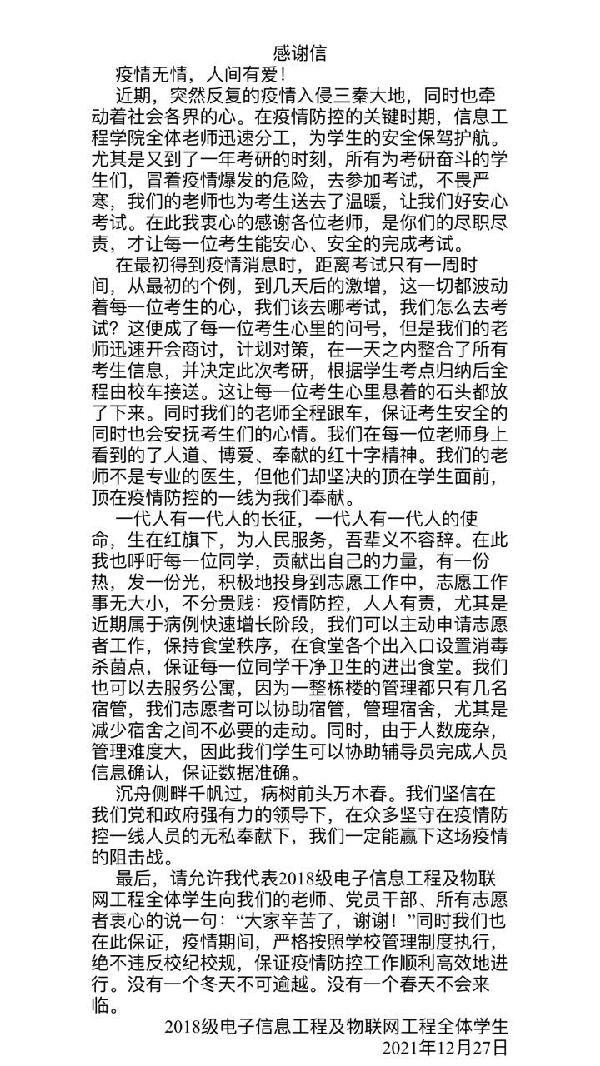 疫情无情,人间有爱!-----信工学子深情致谢 近期,突然反复的疫情入侵三秦大地,同时也牵动着社会各界的心。在疫情防控的关键时期,英国365集团官网全体老师迅速分工,为员工的安全保驾护航。尤其是又到了一年考研的时刻,所有为考研奋斗的员工们,冒着疫情暴发的...