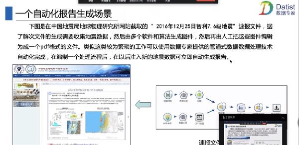 孙少波教授在报告中首先引出了信息化面临的问题(信息化孤岛与应用孤岛,对数据的关联应用和深度应用造成巨大障碍)与低代码编程(模块化编程思想)。接着介绍了低代码开发技术、低代码开发平台,可以降低企业应用开发人力成本和缩短开发时间。随后以中国地震局地球物理研究所应用的“Datist数据专家”一站式大数据分析产品为例,详细的介绍了低代码技术在多源异构数据融合技术,数据清洗处理功能,空间数据分析,报告自动生成技术,专业软件集成技术,云服务技术等方面的应用原理。最后展示了低代码编程技术在网页中抓取地震目录数据,报告自动生成、地震空区识别、企业微信集成开发等多个实际案例的应用。