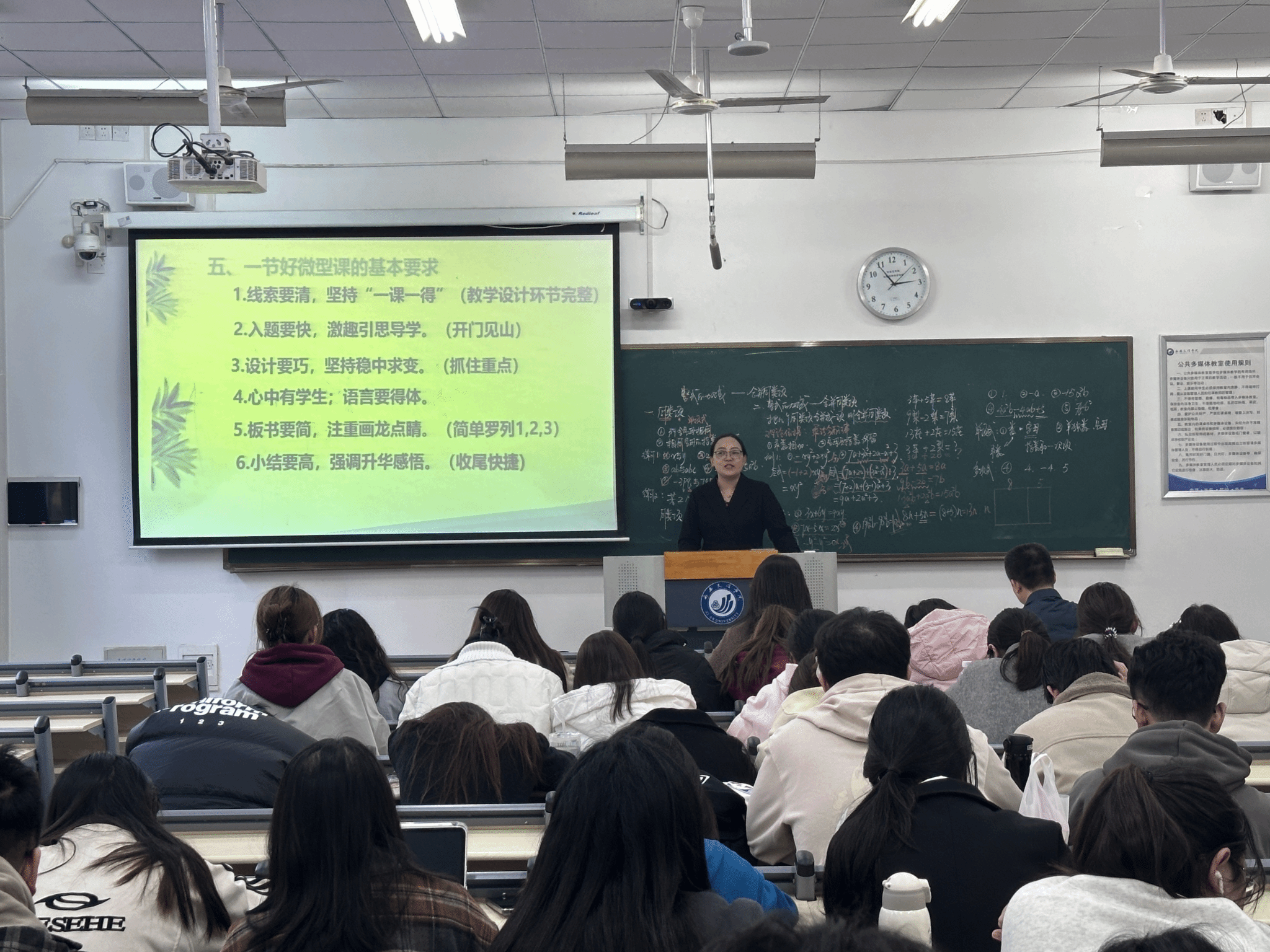在会议的开始,惠晓蕊老师为大三员工展示了一堂题为《整式的加减—合并同类项》的微型示范课。在教学过程中,惠老师详细讲解了同类项的定义以及整式的加减。课堂导入贴近员工生活,概念阐述和辨析分析精准,例题推理逻辑清晰,板书书写规范且布局合理。她的教学方法新颖灵活,讲解从容不迫,赢得了员工们的热烈掌声。