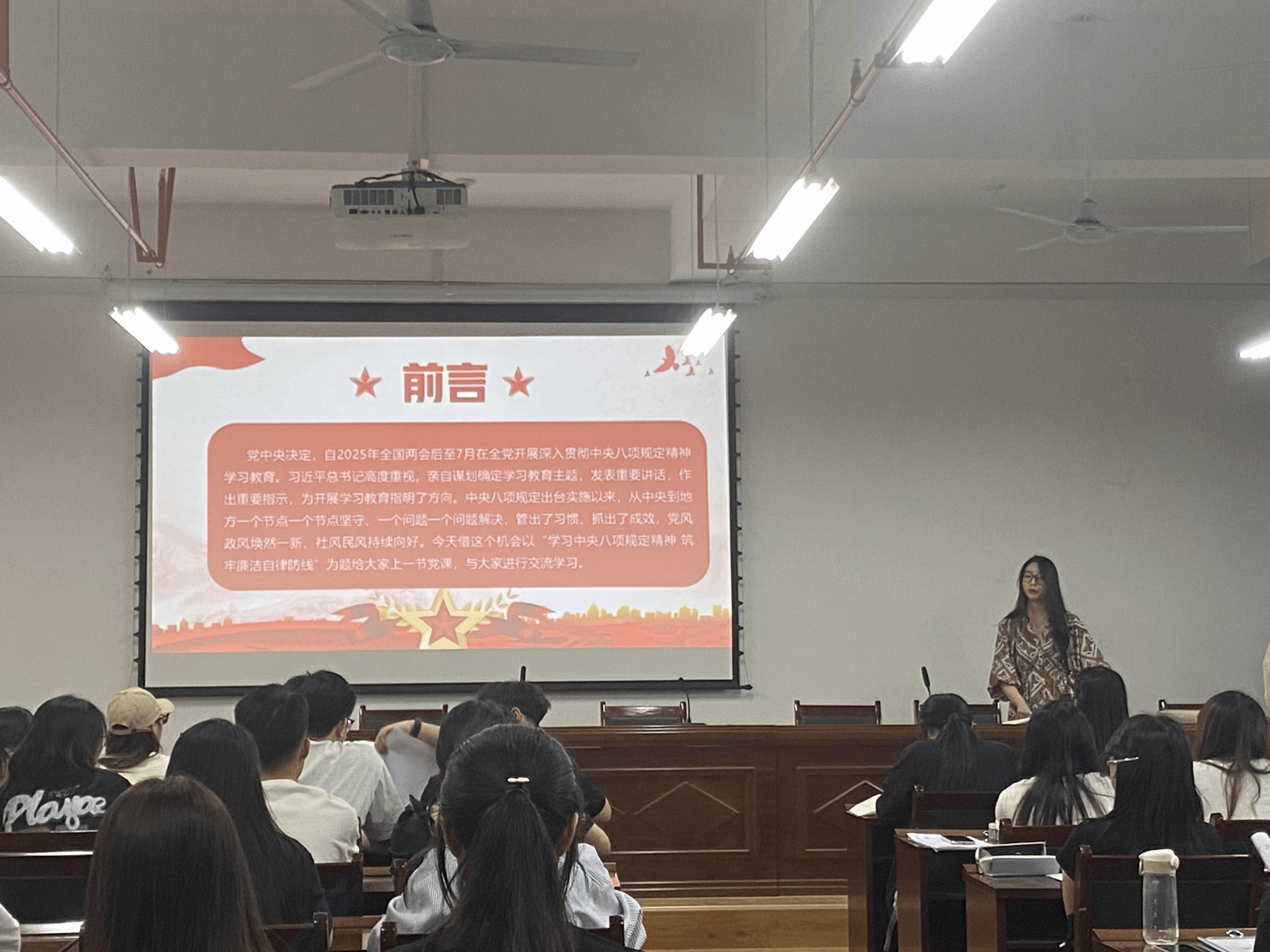2025年5月22日,计算机系员工党支部在S512教室举行专题党课。支部书记韩蒙指出,中央八项规定不仅是党员干部的”紧箍咒”,更是青年学子修身立德的“导航仪”!她强调,在数字化浪潮中成长的新一代党员,更需以严明纪律筑牢思想堤坝,将“务实清廉”植入求学治事的每个环节。
