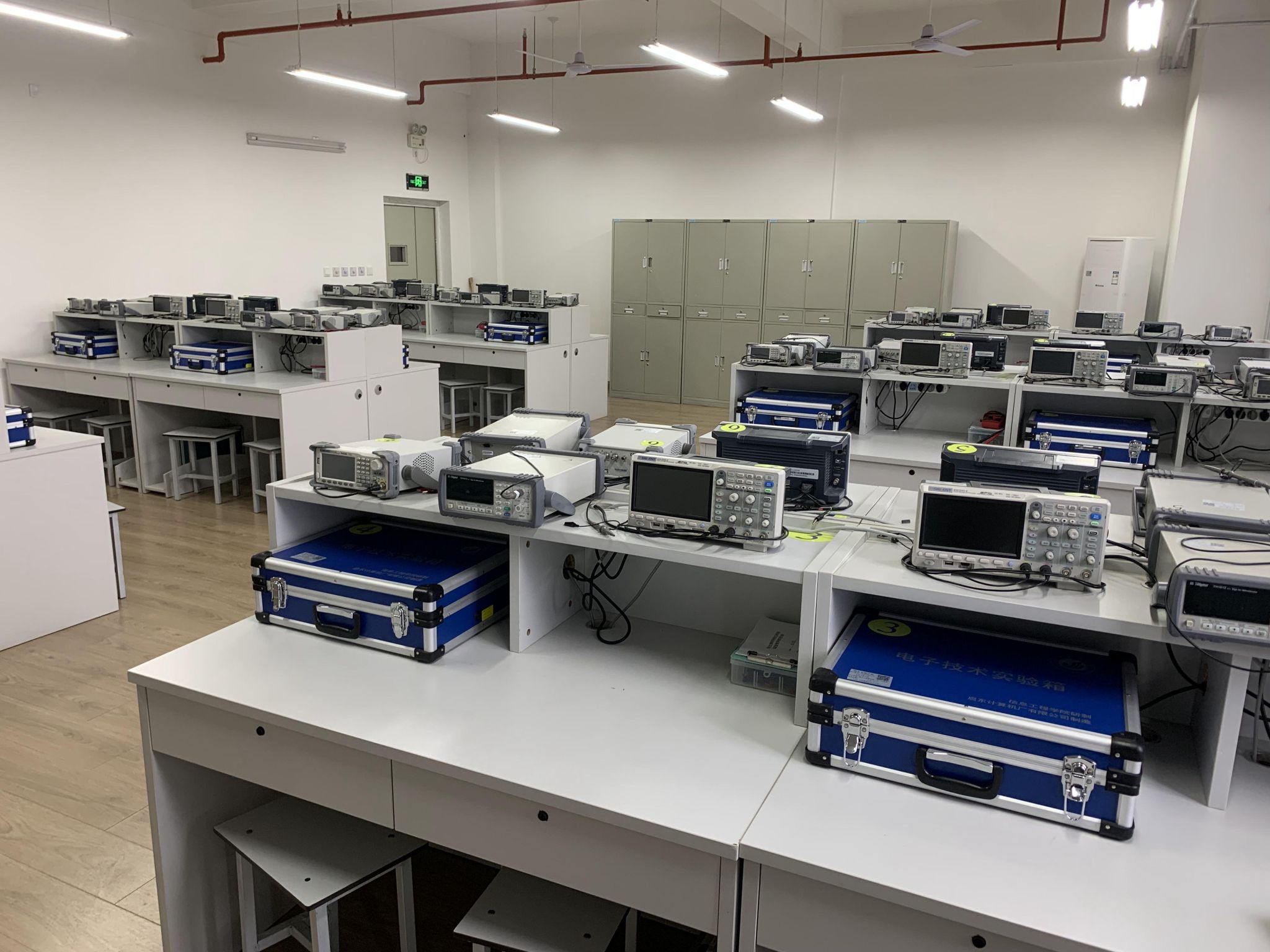 电子技术实验室始建于2006年,是计算机硬件综合实验室下设的分室,并于2018年进行设备更新,实验室现有面积为96平方米。实验室设备主要包括数字与模拟电路二合一实验箱25套、数字示波器25套、数字信号发生器25套、数字交流毫伏表25套、台式万用表2套、万用表25台、以及台式计算机、投影、幕布等,总价值40万余元。