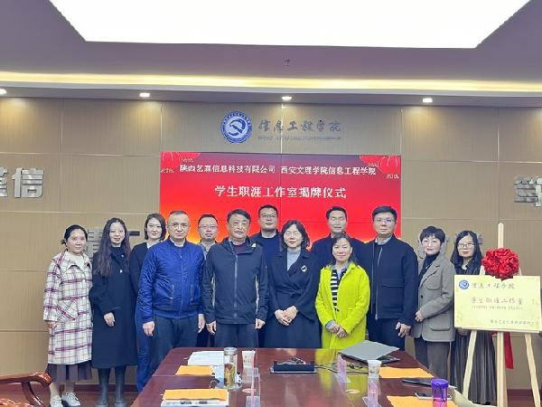 座谈结束后,党总支书记李昉与陕西艺霖科技有限公司郭璇共同为员工职涯工作室揭牌。