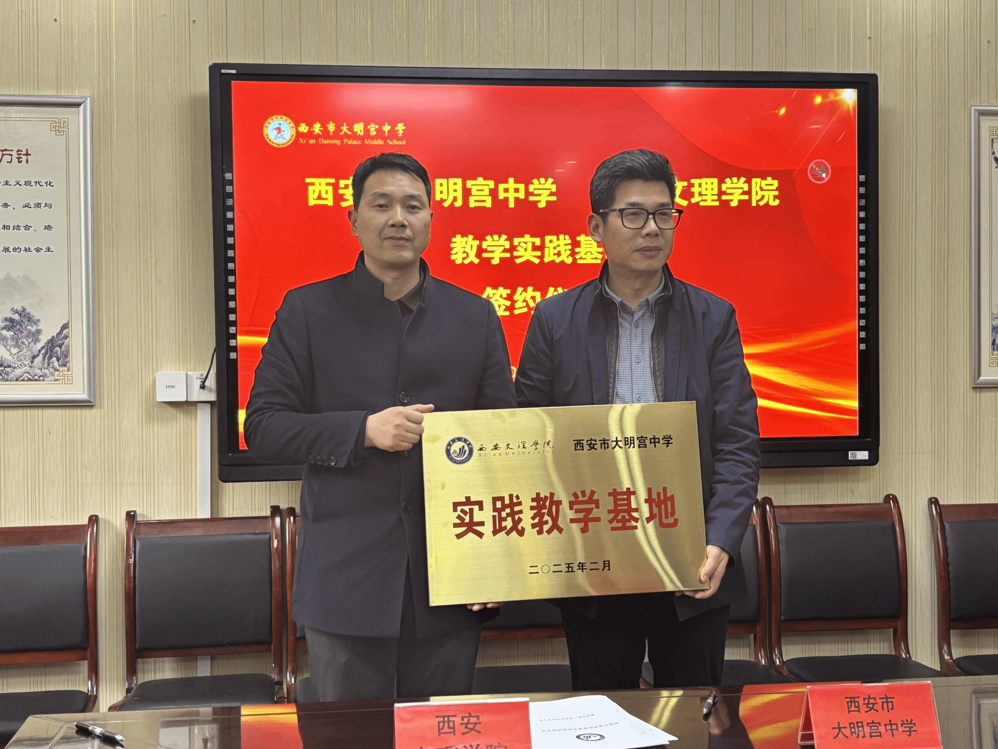 陈广锋经理向校方介绍了公司一行人员,并对校方的热情接待表示感谢。他详细介绍了公司、公司近几年的发展情况,并表示期待双方能在课题联合申报、实习实践教学、人才培养等方面加强合作,共同推动教育事业的发展。双方进行教育实践基地的现场签约并挂牌,标志着公司与大明宫中学的合作迈上了新的台阶,为双方未来的深度合作奠定了坚实基础。