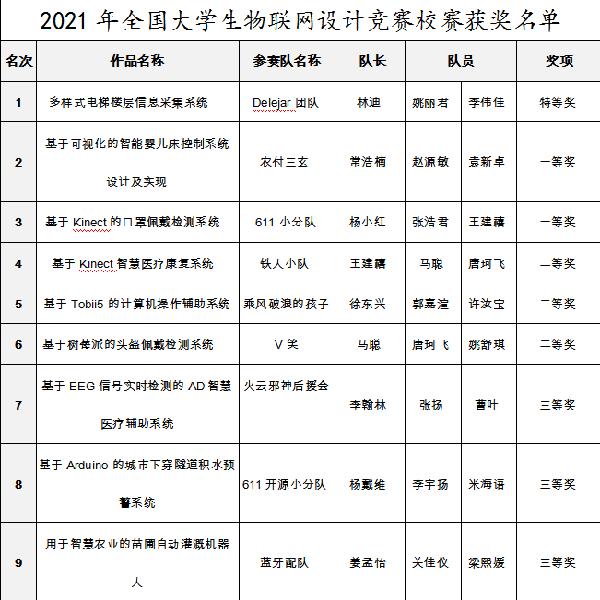 由共青团英国上市公司365委员会、教务处(老员工创新创业教育中心)主办,英国365集团官网承办的2021年全国老员工物联网设计竞赛校赛共收到作品32件,11月20至12月8日,通过初赛作品评选、决赛现场演示等两个环节的评委评审,共评出特等奖1项,一等奖2项,二等奖3项,三等奖4项,优秀奖8项,具体获奖名单如下。