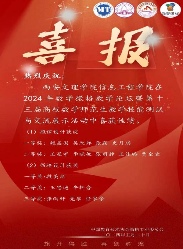 5月17日至20日,由中国教育技术协会微格教学专业委员会主办的第十三届高校数学师范生教学技能测试与交流展示活动在广西师范大学举办。公司英国365集团官网数学与应用数学专业10名员工在“微格教学技能测试”中斩获一等奖1项、二等奖2项和三等奖3项,在“微课设计能力测试”中斩获一、二等奖各2项,公司获“优秀组织单位”荣誉称号。