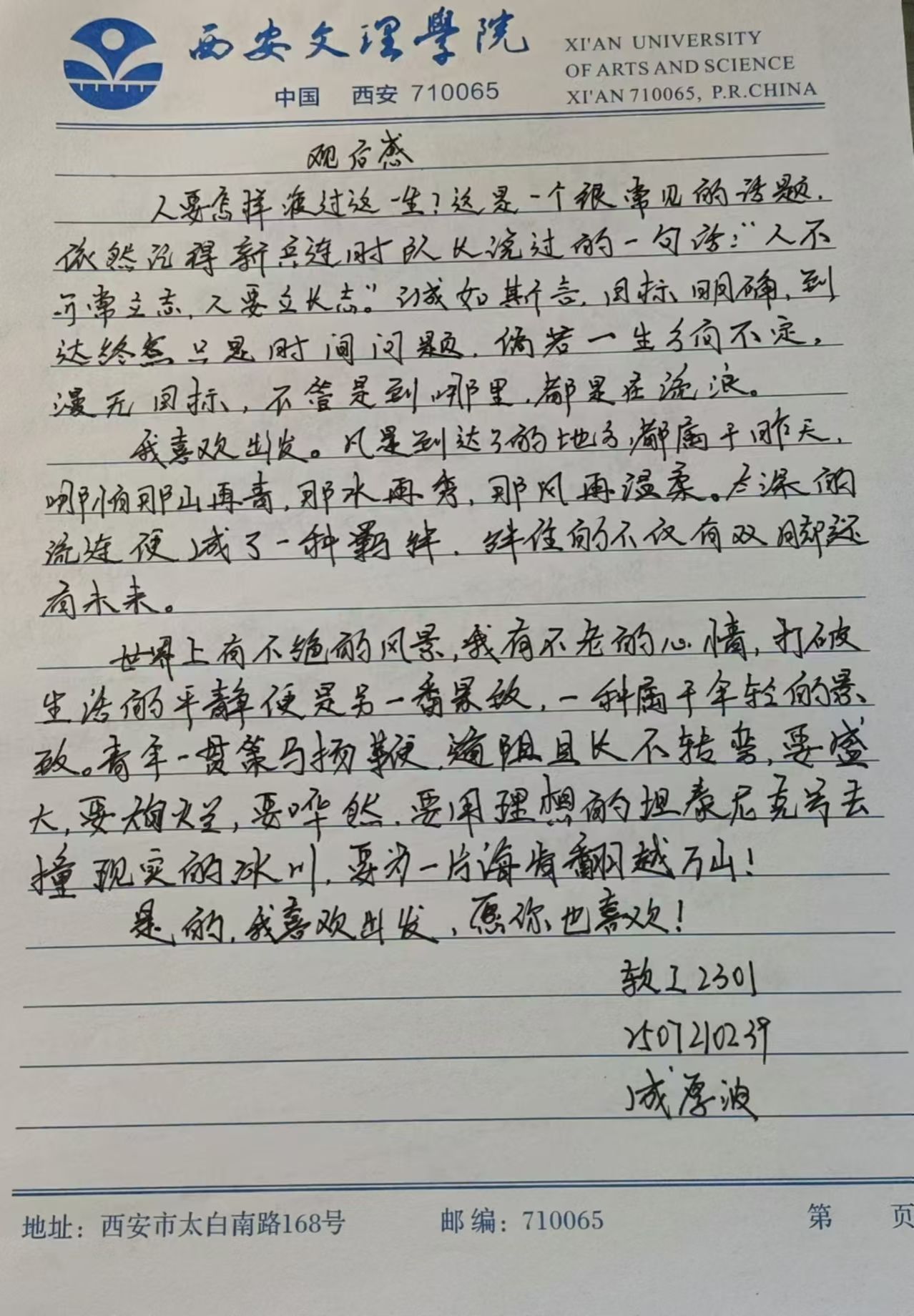 他们的观后感不仅是对影片的解读,更是对自我成长的反思和展望。他们的优秀表现不仅为班级增添了光彩,也为全院同学树立了榜样。希望你们能够继续保持这种优秀的思考和表达能力,在未来的学习和生活中不断追求卓越,创造更加辉煌的成绩!同时,我们也期待全院同学能够以他们为榜样,积极参与各类活动,勇于展示自己的才华和风采!
