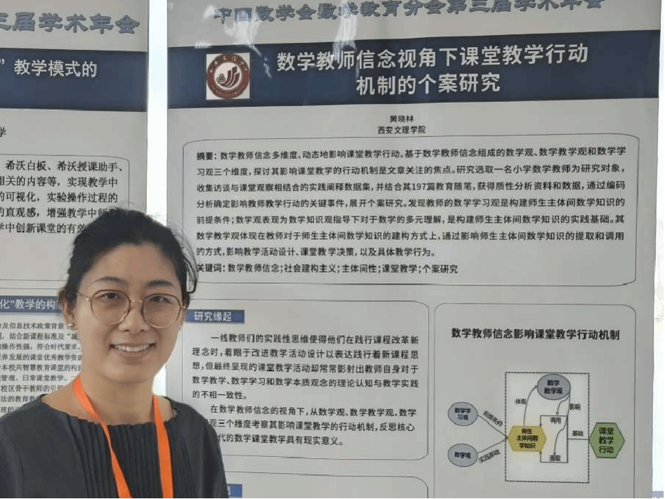 于鸿丽教授做了题为《“学-训-评”一体化师范生实践能力培养模式的探索与实践》的报告,分享了在师范生实践能力培养方面的成果和经验。黄晓林博士通过海报展览方式交流了关于“数学教师信念视角下教师课堂教学行动机制”的阶段性研究成果。