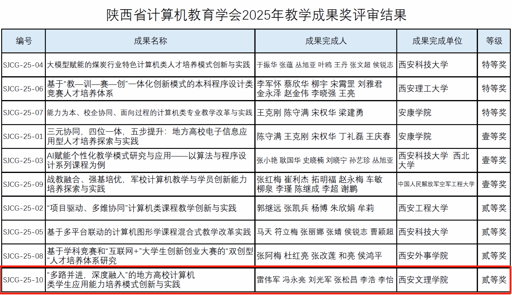 雷伟军教授团队申报的《“多路并进,深度融入”的地方高校计算机类员工应用能力培养模式创新与实践》获评教学成果二等奖;徐阳扬副教授编写的教材《Arduino应用开发》荣获优秀教材一等奖;赵宁社副教授成功获批学会教改项目。这些成果充分展现了公司在计算机教育领域的创新实力与教学水平。